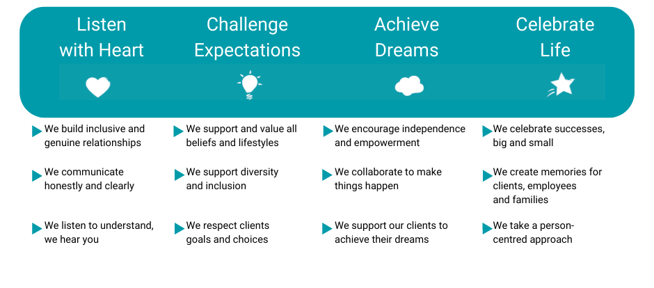 TRUST We will work with you to build inclusive and genuine relationships. You can trust that we will care about you and will support you. We promise to keep trying to get better at what we do.